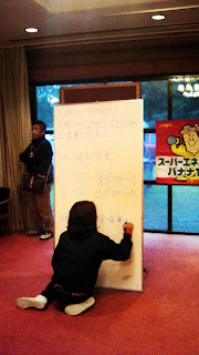 会場となるプリンスホテルの入り口。看板の左右にグレートアースの幟が立っていますが、フロントガラスの雨で見えません。 |